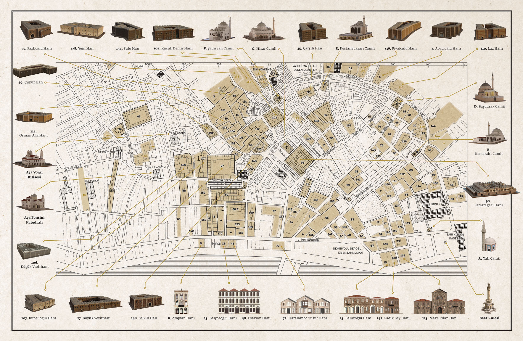 Wolfgang Müller-Wiener’in İzmir’in liman ve çarşı bölgesinin planı. Camiler (noktalı), hamamlar (çapraz çizgili), kamu binaları(taralı) ve hanlar (katalog numaraları ve - mümkün olduğunca - şematik zemin planı ile) verilmiştir.